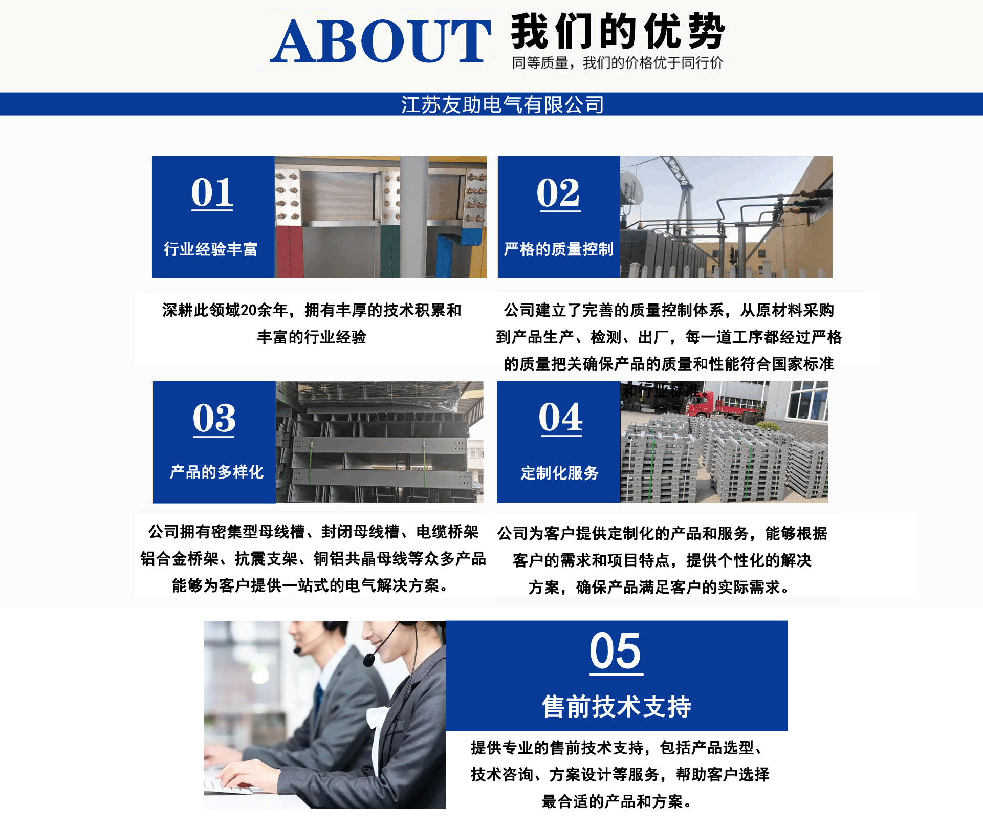 江蘇友助電氣有限公司地處中國工程電氣生產基地-一江蘇省揚中市。經營范圍:電纜橋架,母線槽(橋),管型母線,銅軟連接(伸縮節),高低壓開關柜,配電箱,抗震支架產品系列。 公司宗旨:客戶至上。已成功為江蘇二十屆省運會會場-泰州體育館,南京寶龍商業綜合體,張家口百兆瓦風電場,濟源市婦幼醫院,威海市未來科技園,湖北皇恩燁新材料科技有限公司,南京中央路小學,南通中天大酒店,新疆新安特鋼有限公司,河北省送變電有限公司,南京南微醫學研發基地等多項工程配套服務,我們愿與您精誠合作,互利共贏!公司技術人員深耕橋架,母線領域30年,為您提供橋架,母線槽疑難問題解決方案。母線槽不論每相是單排,雙排,三根排重疊,不管有多少個水平彎、垂直彎,轉接排在發貨前預裝一遍,確保尺寸無誤。到現場直接擰螺絲,效率高,橫平豎直,規規矩矩,符合標準,供電局,業主,監理,驗收易通過。供貨周期3-7天。為了讓尊貴客戶您,設備安全通電,高枕無憂。我們提供如下售前售中售后服務: 售前:免費技術支持,咨詢?!∈壑?免費現場精確測繪、設計。 售后:安裝服務,免費指導?!≠|量是生命,客戶是源泉。承諾客戶的,一定全力做到。讓我們一起進步!...